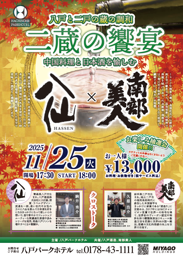 この度、岩手二戸市「南部美人」様と八仙をお楽しみいただける八戸と二戸の蔵の調和「二蔵の饗宴 」中国料理と日本酒を愉しむ「八仙×南部美人」の開催が決定いたしました。